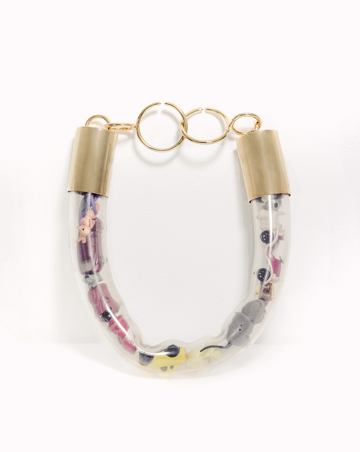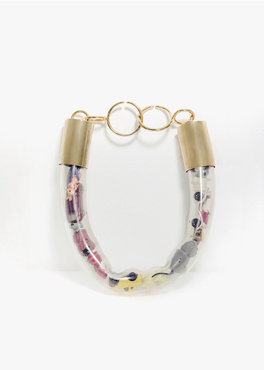 Necklace made from 3cm diameter tube with endings gold plated silver 925. These endings are topped by an open chain clasp.